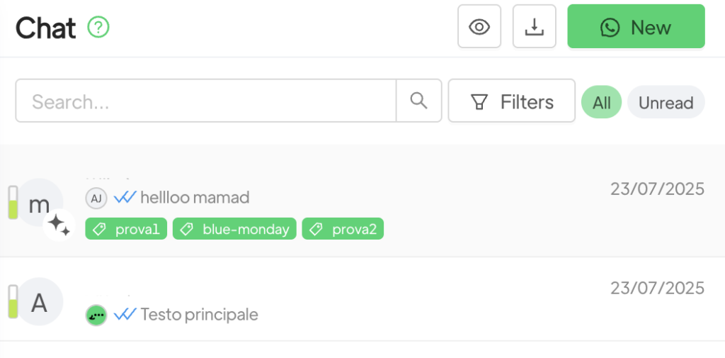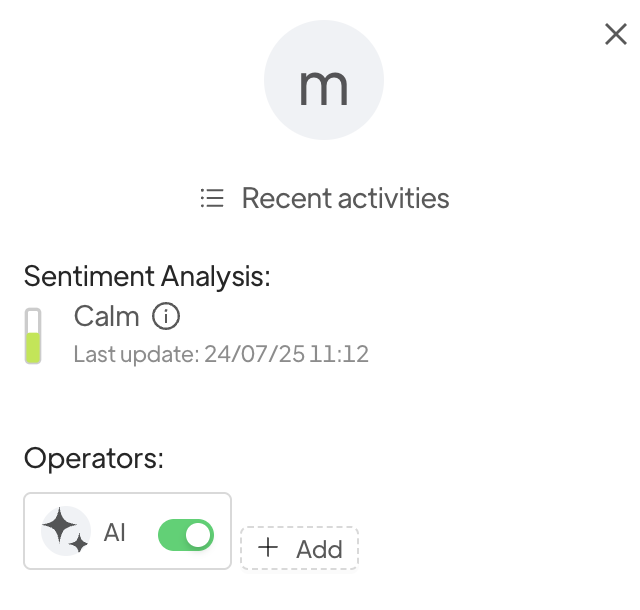 Quando apri la pagina di chat di un contatto, vedrai una nuova icona a forma di termometro che indica il sentiment associato a quel contatto, situata appena sotto l’immagine del profilo sulla destra della pagina. La stessa icona è visibile anche sotto l’immagine del profilo di ogni contatto analizzato nella sezione cronologia chat sulla sinistra.