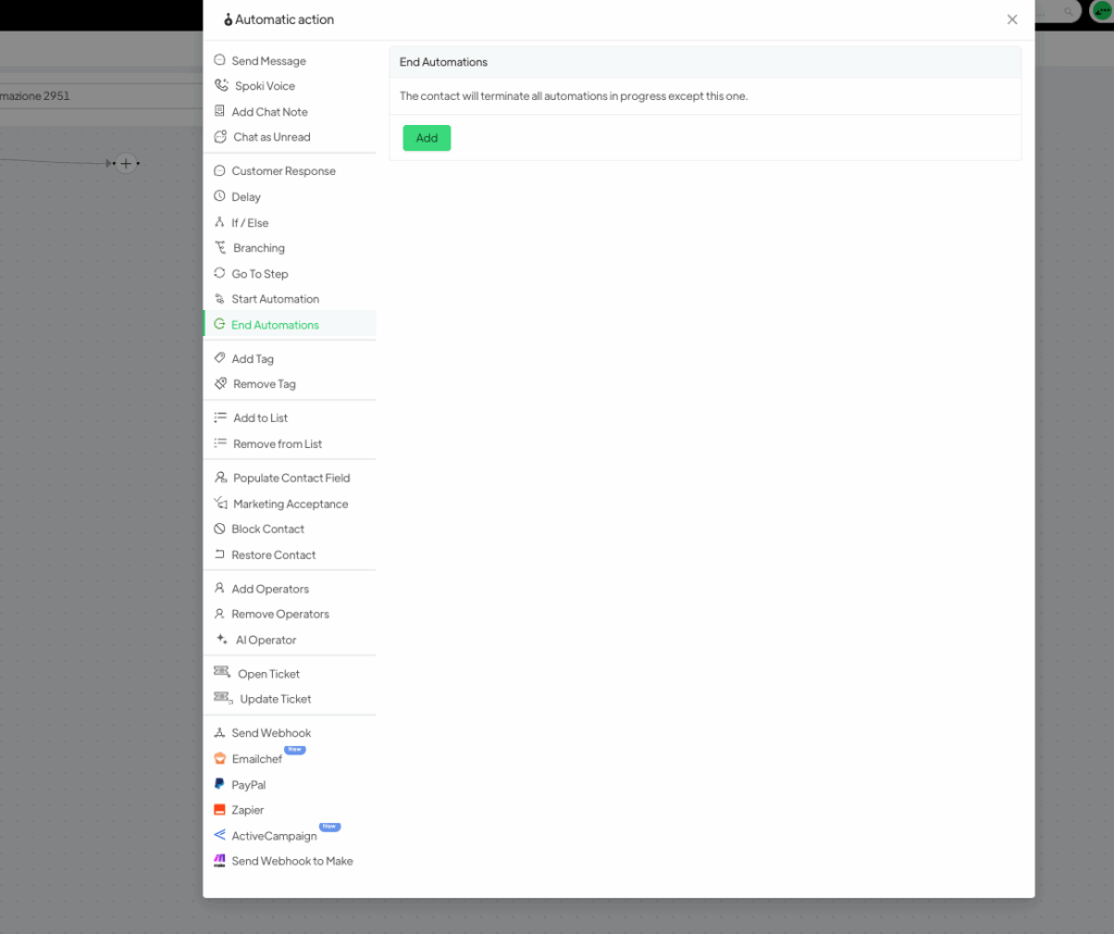 Vai nel menu Automazioni >> Nuova >> Tua azione automatica e seleziona Termina Automazioni