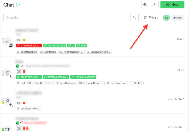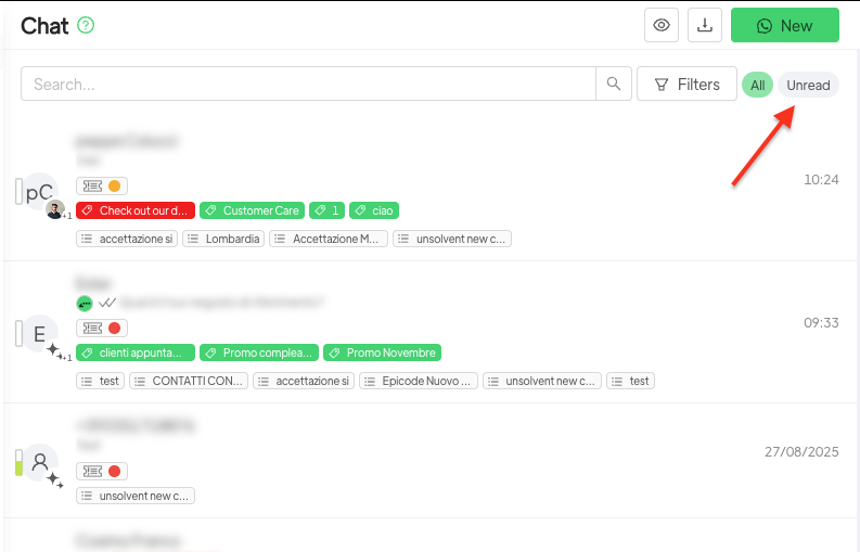 È possibile visualizzare le chat non lette e contemporaneamente effettuare un filtro su tag o liste.