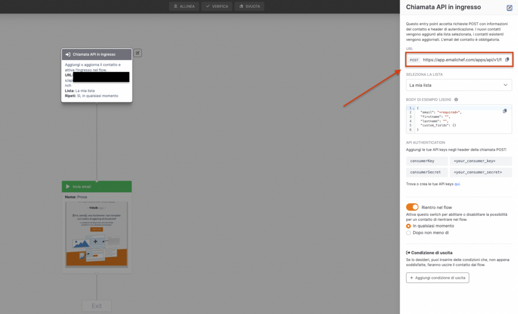 All’aggiunta del trigger EmailChef si genererà un url e una secret che devi copiare perché serviranno nel prossimo passaggio.