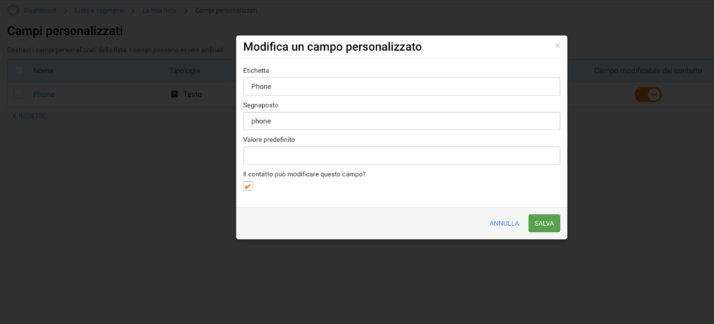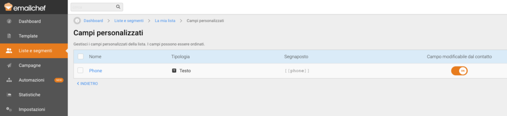 Vai su EmailChef e assicurati che nella sezione Dashboard > Liste e Segmenti > {nome_lista} > Campi personalizzati ci sia il campo “Phone“, se non c’è aggiungilo.