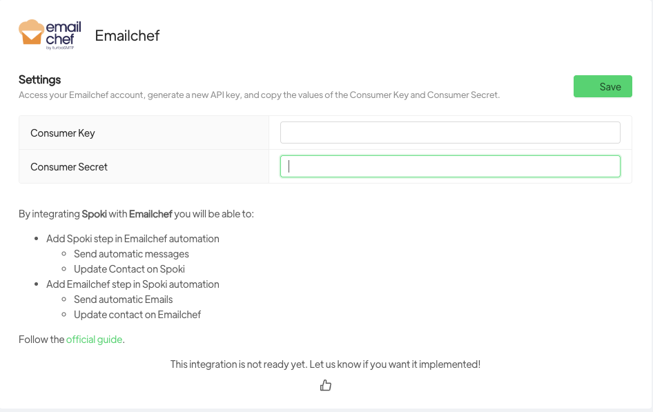 1.2.1 Da Spoki vai su Integrazioni -> EmailChef. Attiva l’integrazione e incolla le due chiavi copiate prima da EmailChef.
