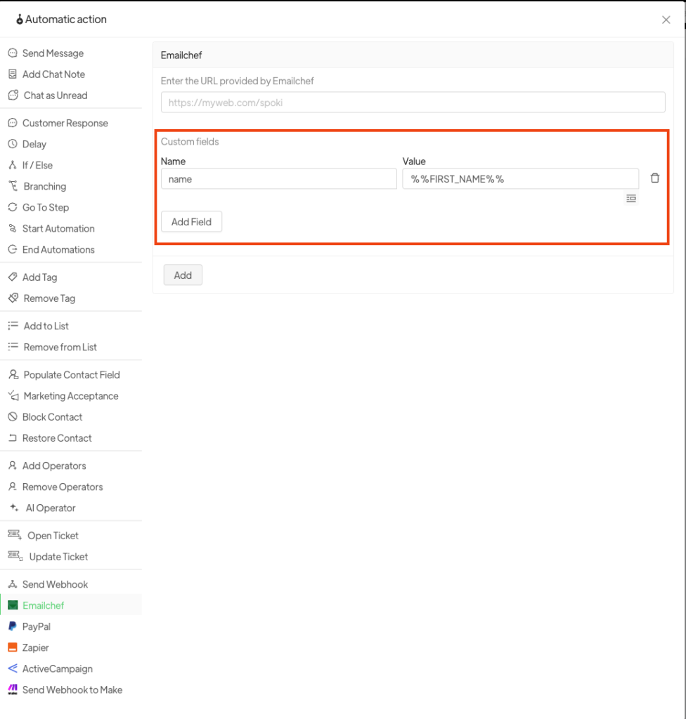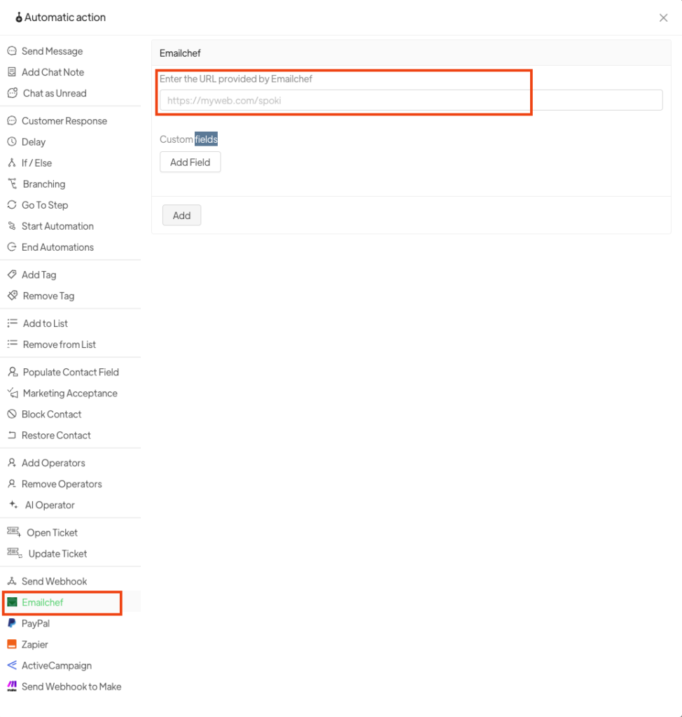 1.4 Torna su Spoki e apri/crea un’automazione. Aggiungi un nuovo step e seleziona EmailChef. Incolla l’URL copiato da EmailChef e infine clicca su Aggiungi