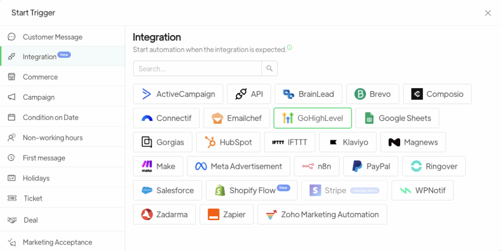 - Seleziona Go High Level dall’elenco integrazioni