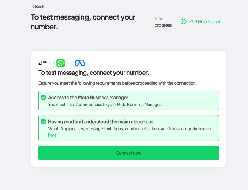 Congratulazioni, hai terminato il processo di attivazione di Spoki con il tuo numero di telefono! Verrai riportato direttamente alla Dashboard della piattaforma e Meta impiegherà fino a 24 ore per approvare il tuo numero di telefono.