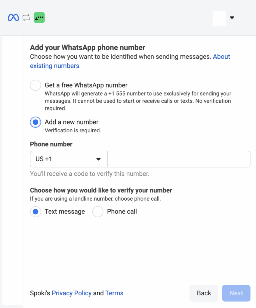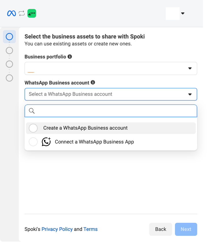 7. Nella sezione che segue seleziona il portfolio business corretto e selezionare l’opzione Create WhatsApp Business account per creare un nuovo account da collegare a Spoki nel menù a tendina e premere Next per proseguire.