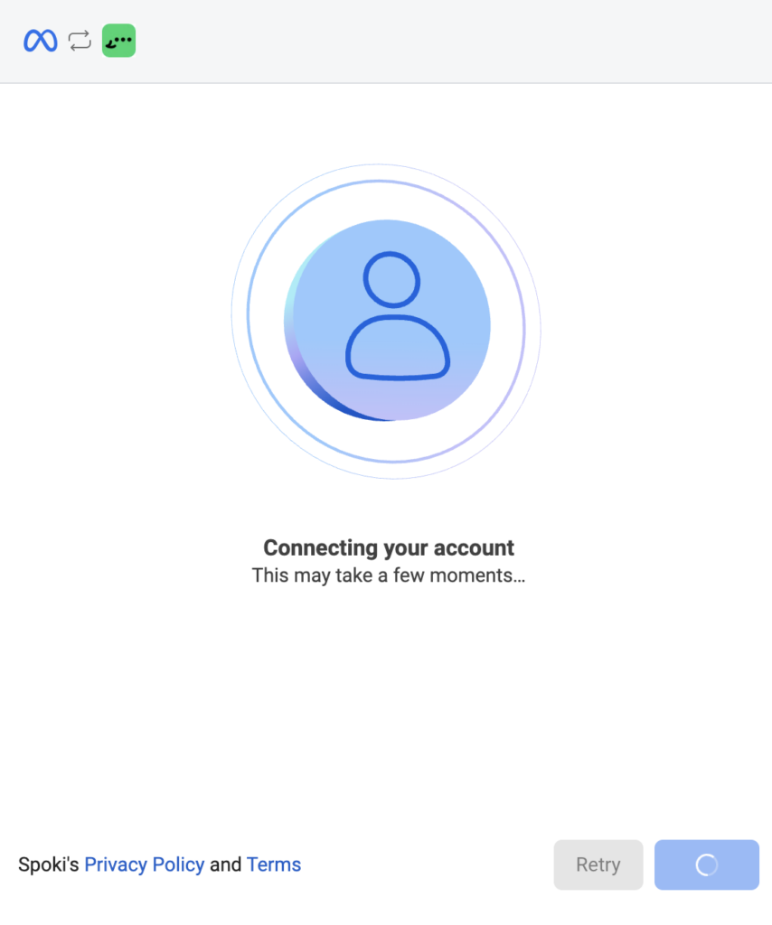 6. Nella scheda che segue, seleziona nel riquadro in alto a destra il profilo legato al business portfolio dell’azienda da collegare a Spoki. Se non hai fatto login con il tuo account, puoi cliccare nel menù a tendina l’opzione Add another account per aggiungere manuale il profilo giusto, poi clicca su Continue.