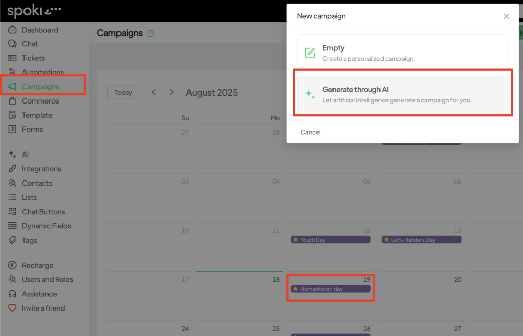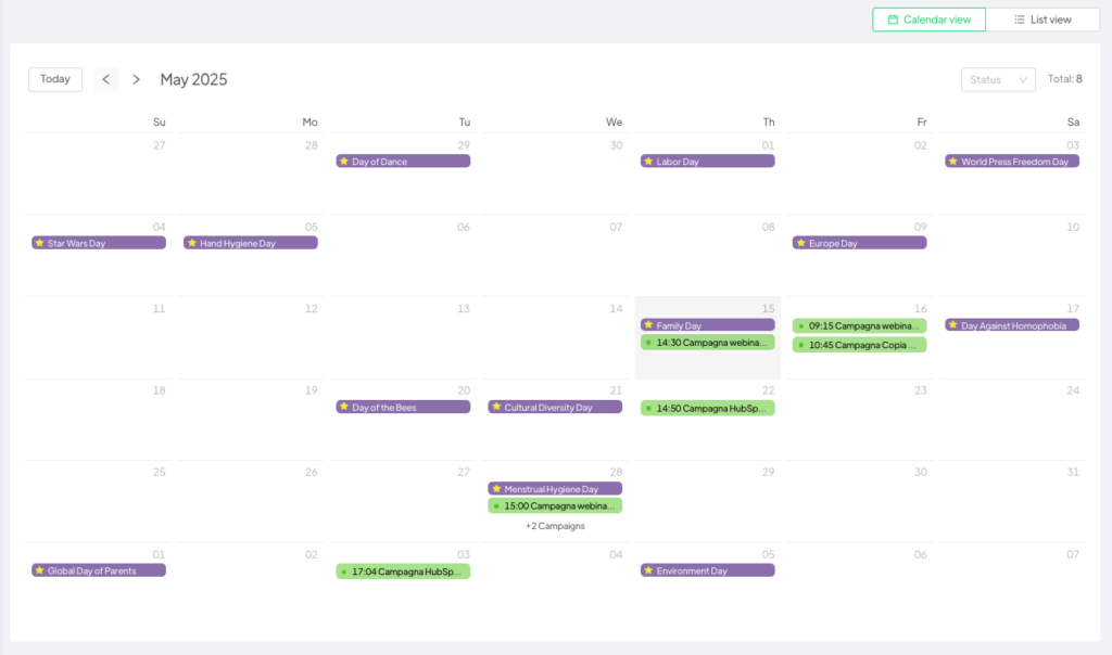 Entrando nella sezione Campagne, la schermata principale mostra una vista calendario che evidenzia tutte le campagne programmate. Qui puoi vedere anche festività e ricorrenze, elementi utili per pianificare le comunicazioni nei momenti più strategici.