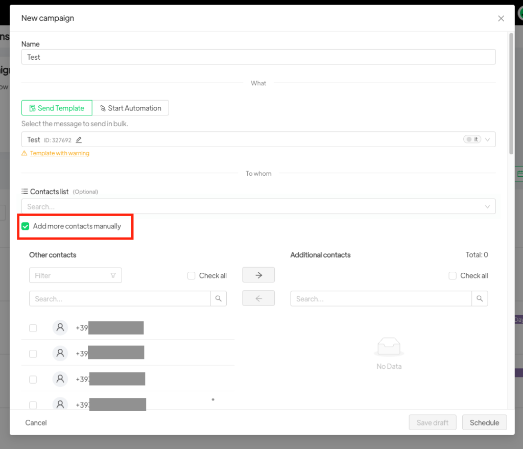 E’ possibile inoltre aggiungere dei contatti non presenti in una lista in una campagna bisogna cliccare sulla Box sotto Contatti aggiuntivi.