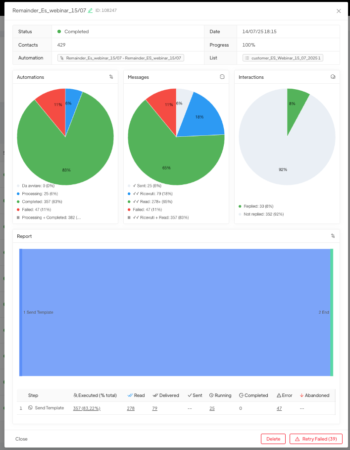 Per le automazioni: vengono indicati numero e percentuale di automazioni ancora “Da avviare”; le automazioni “in corso” queste automazioni sono quelle per cui sono previsti più step, per cui per questo numero di contatti ci sono ancora degli step che potrebbero essere completati; “Terminate” sono le automazioni completate in tutti gli step impostati; “Fallite” sono le automazioni per cui non è stato possibile inviare il messaggio contenuto nell’automazione perchè ad esempio il numero del contatto non è valido.
