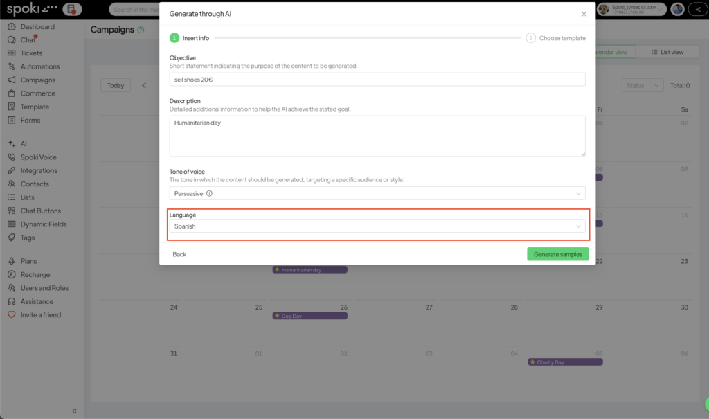 Cliccando su un evento puoi generare automaticamente un template tramite l’AI, selezionando la lingua desiderata e ottenendo così un contenuto subito pronto per la tua campagna.