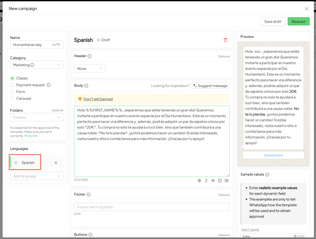 Per inviare una campagna è necessario disporre di un template approvato da Meta, che conterrà il messaggio da recapitare ai destinatari.