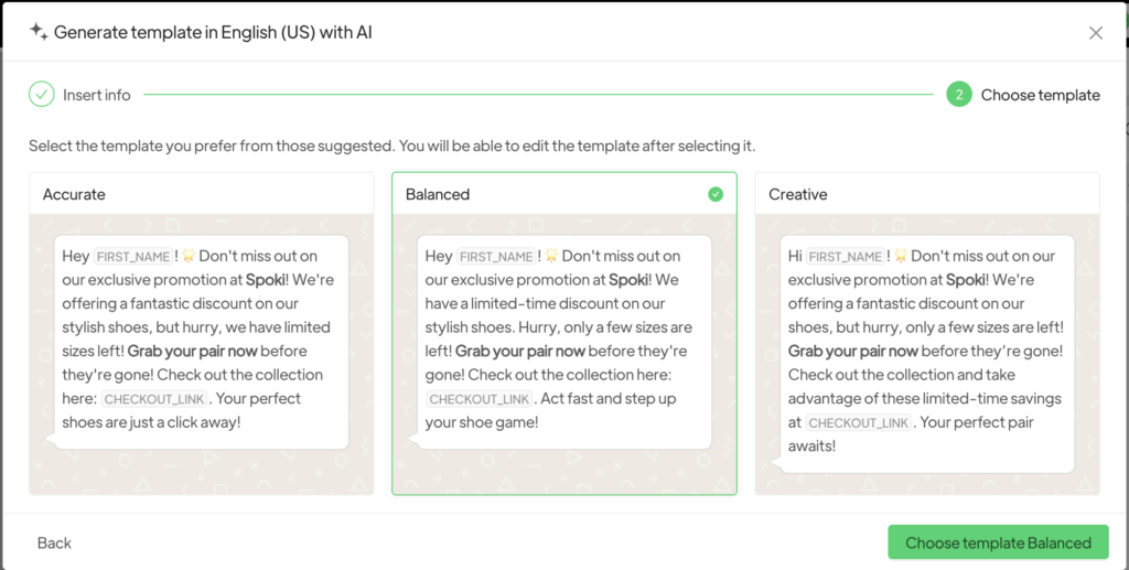 La categoria del template selezionata in Spoki può essere modificata da Meta in base ai propri algoritmi di classificazione automatica.