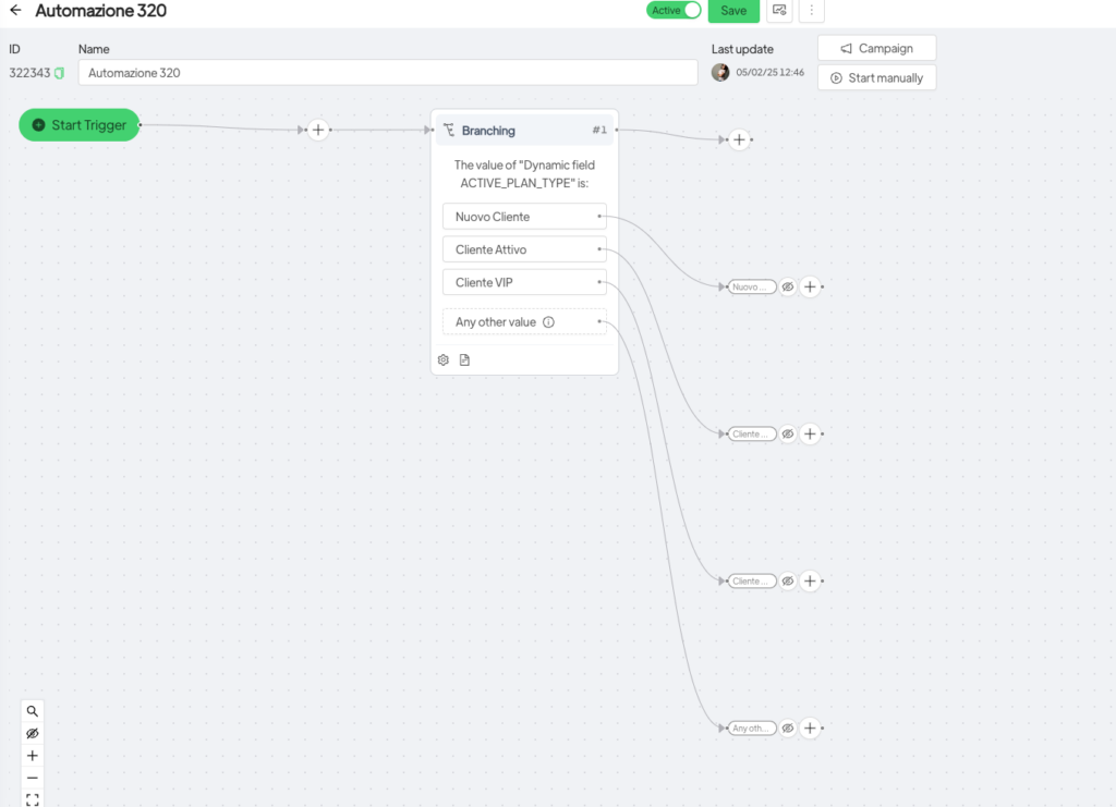The Branching option allows you to route contacts through different paths based on specific criteria. Essentially, you can check the value in a given field and, depending on its content, direct the contact down a particular path. This tool is essential for tailoring automations and ensuring that each contact receives the most relevant action for their needs.