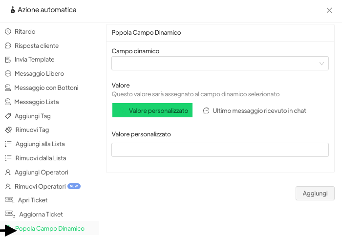 select custom value to set the populating of a dynamic field the same for all messages sent in that automation (e.g., dynamic field “operator” if the operator name must be “Emanuela” for that sending) This way you can avoid requiring multiple templates if the text varies by one word.