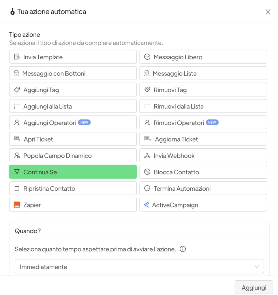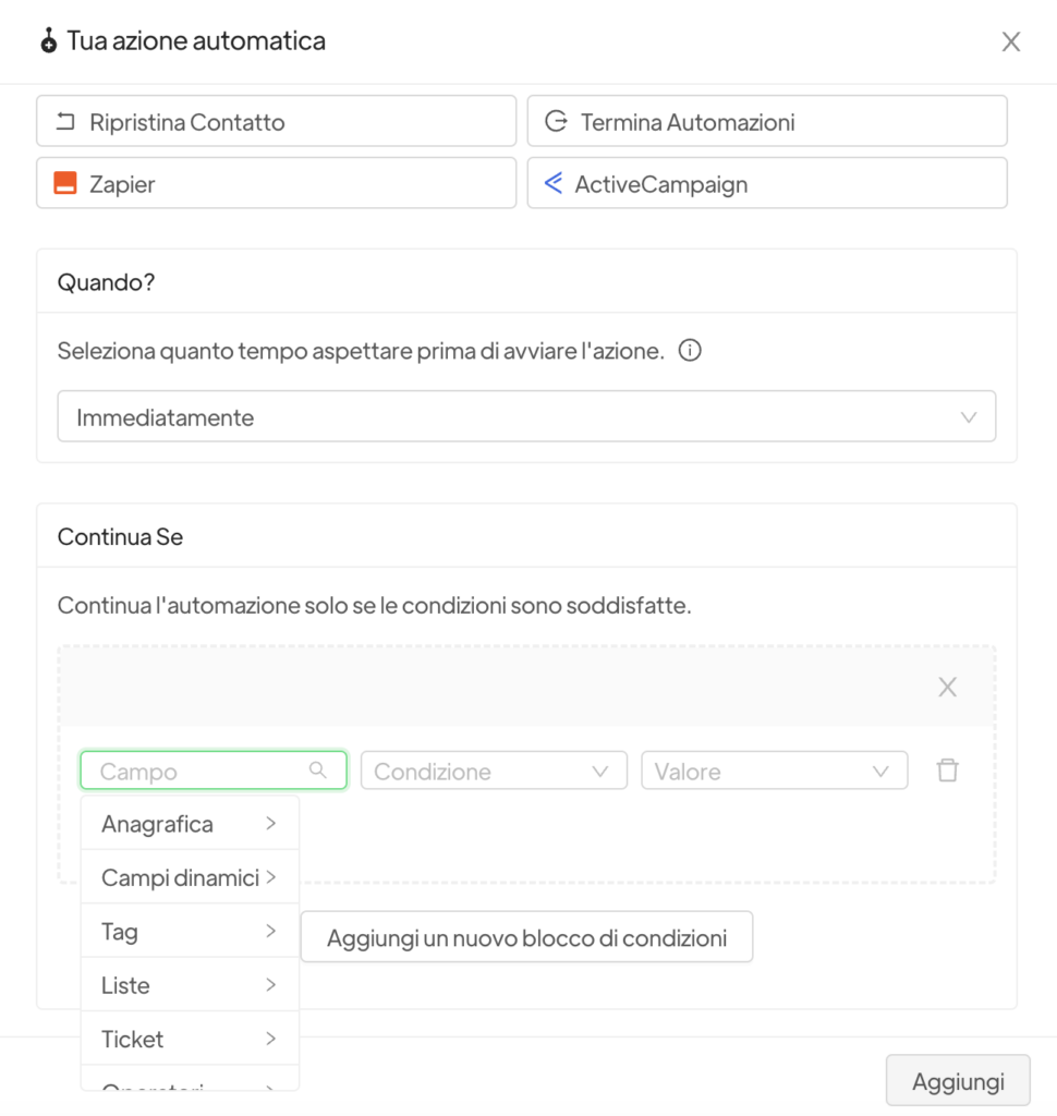 Tickets: you can continue/terminate automation for all contacts that will have the indicated ticket status or priority.