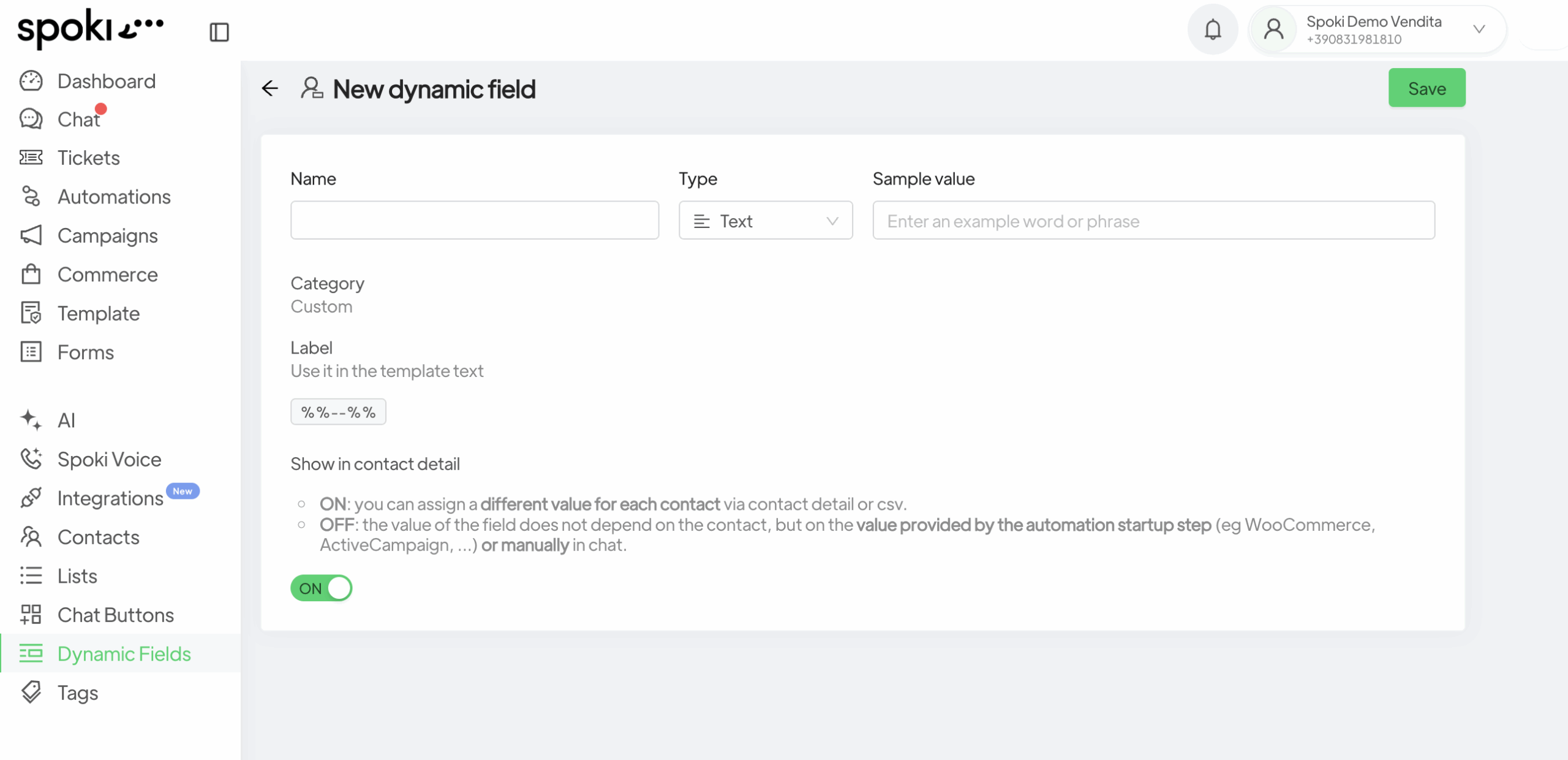 Create the dynamic field: in the Dynamic Fields section, create a new dynamic field by clicking the New button at the top.