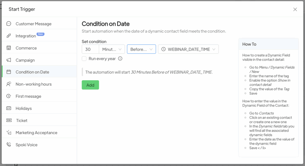 For example, you can select the dynamic field referring to the webinar start time and then set the condition specifying how long before or after that time the message should be sent to the recipient.