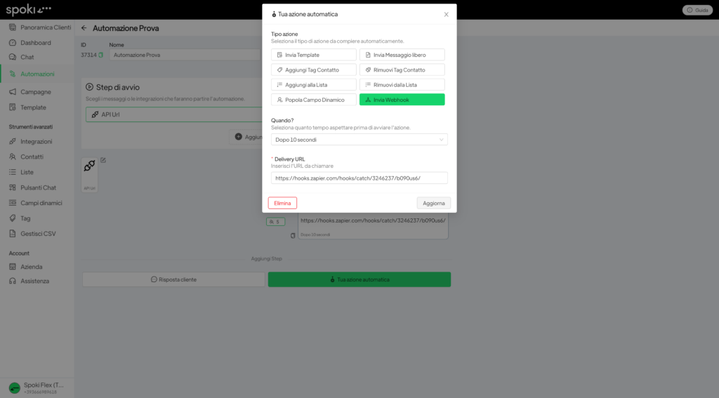 In the automation you will have to select “send Webhook” by clicking on “Your automatic action” and paste the webhook copied from Zapier.