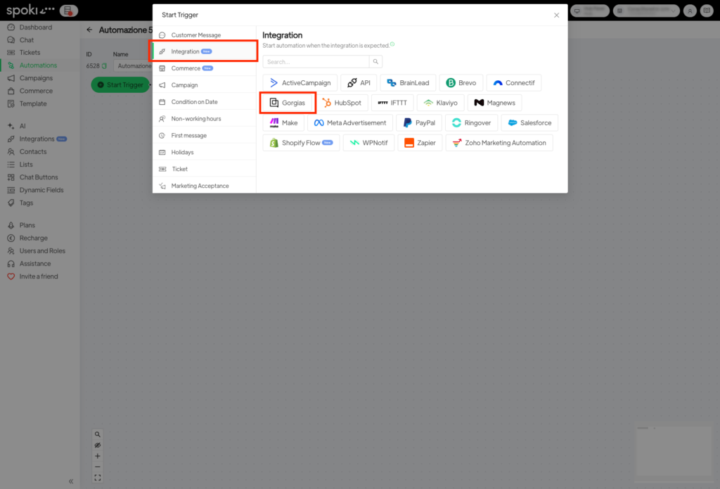 Once you have created your automation, click on Add start trigger and in the menu that appears, select Integrations from the list on the left and finally click on Gorgias.