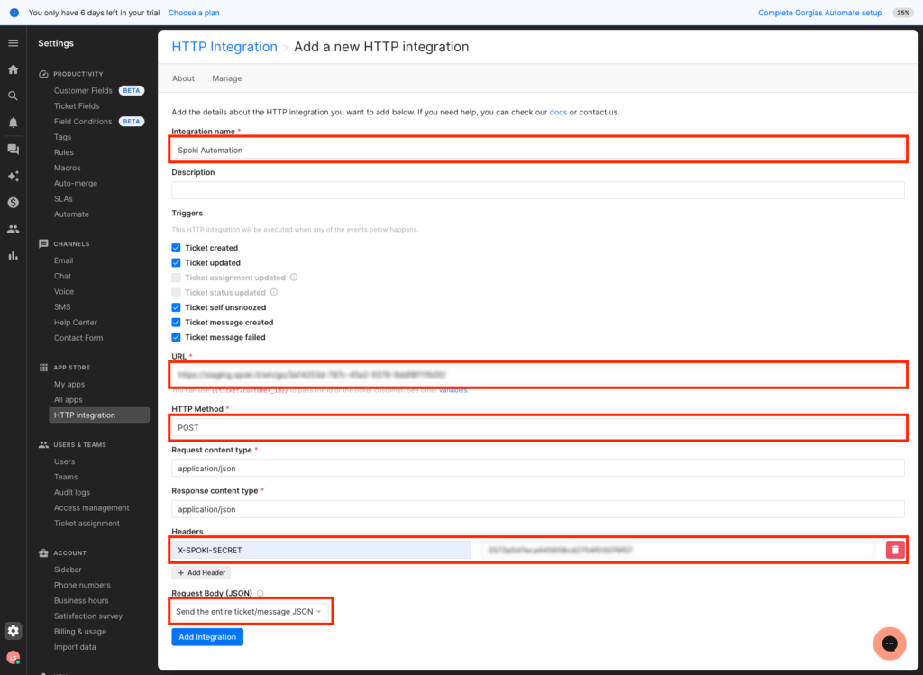 Add a new X-SPOKI-SECRET header and enter the secret provided by Spoki.