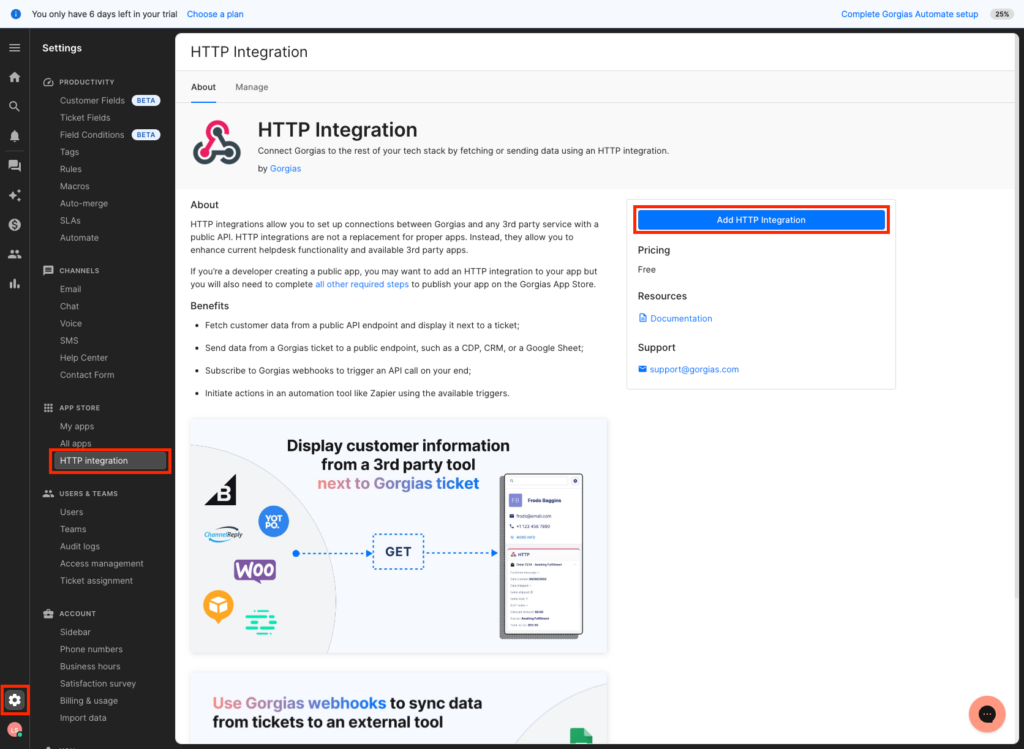 Click on the gear icon in the bottom left, then on HTTP Integration, and finally on Add HTTP Integration.