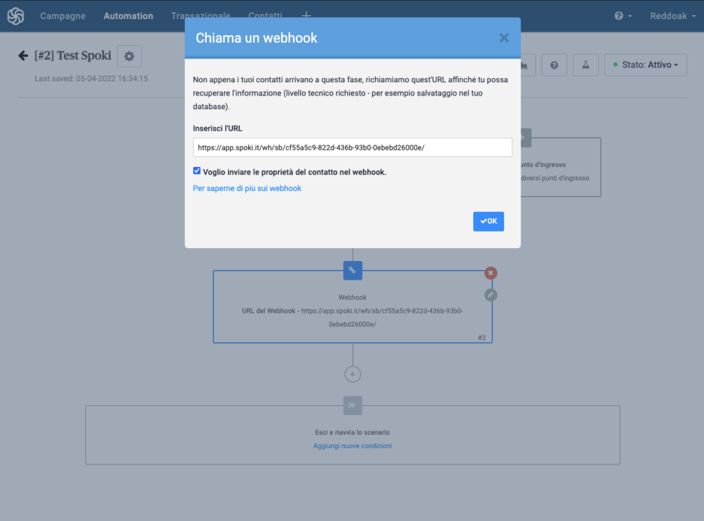 • Set as “URL” the one copied previously from Spoki