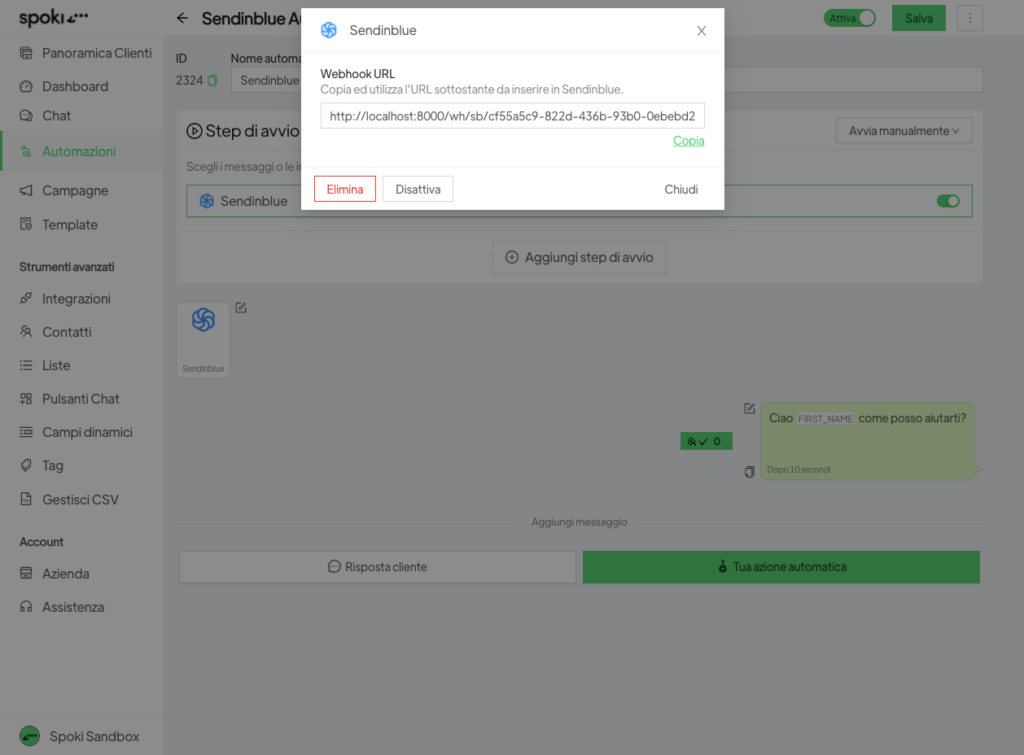 2. Azioni da compiere su Sendinblue: puoi collegare Spoki con Sendinblue tramite Webhook.