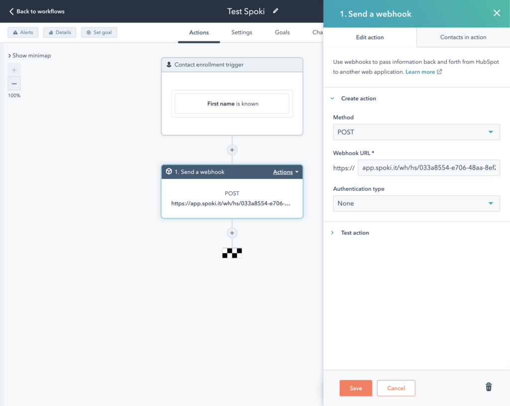 You can add a Step Webhook anywhere in your HubSpot Workflows with a Spoki automation URL (it will be generated by Spoki as a HubSpot Trigger)-offering great flexibility and ensuring that you send the WhatsApp message at the right time.