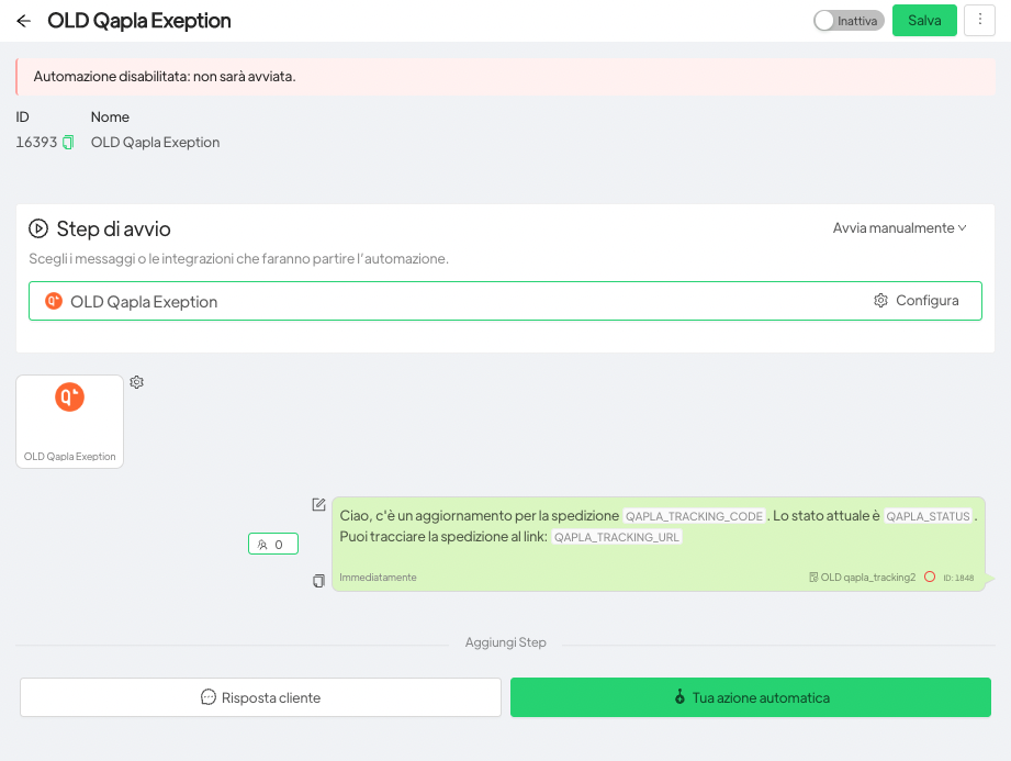 Before activating it, check that the template has been approved (in the Template menu), it takes on average 2 hours. If you prefer to customize the message, create a new template using only and exclusively the dynamic fields available in the sample template. No additional dynamic fields can be inserted. When the template is approved, replace the template in the automation and activate it in the upper right corner. Automation will trigger the first message as soon as it receives information from Qapla’.
