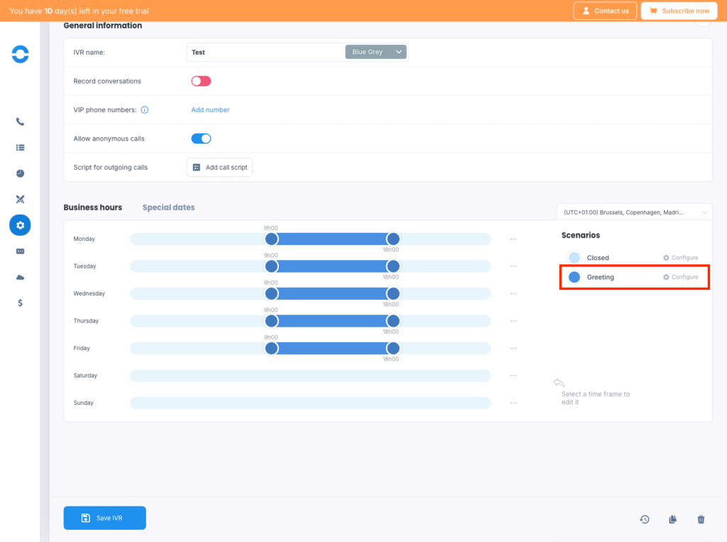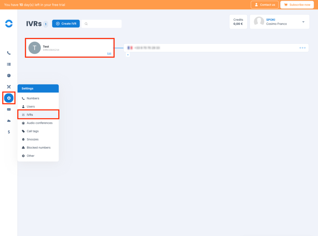 Go to the IVRs section from the menu on the left and click on the specific IVR, in our case, Test.