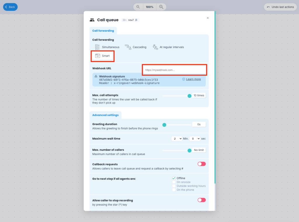 Click on the button shown in the image. Once done, in the Call forwarding section, click on Smart and paste the Webhook URL provided by Spoki.