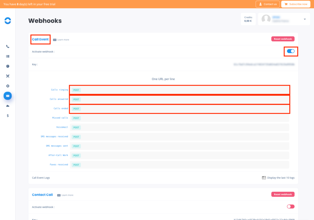 If you haven’t done so yet, log in to your Ringover account and go to the Webhooks section by clicking on this link: https://dashboard.ringover.com/webhooks
