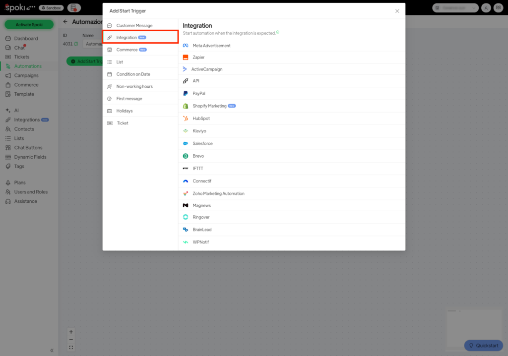 Once you have created your automation, click on Add start trigger, and in the menu that appears, select Integrations from the list on the left, then click on Ringover.