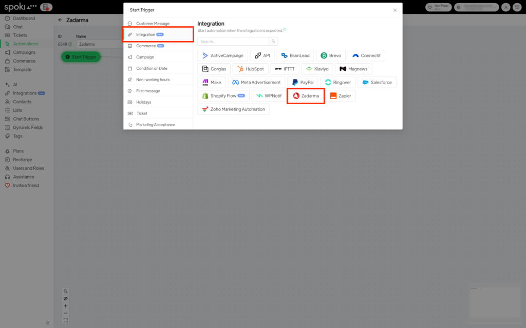 Once you have created your automation, click on Add start trigger and in the menu that appears, select Integrations from the list on the left and finally click on Zadarma.