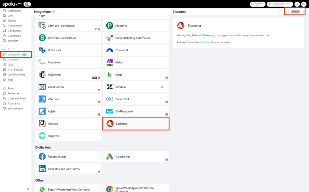 Move to the Integrations section on the right, click on Zadarma and then on Inactive in the top right.
