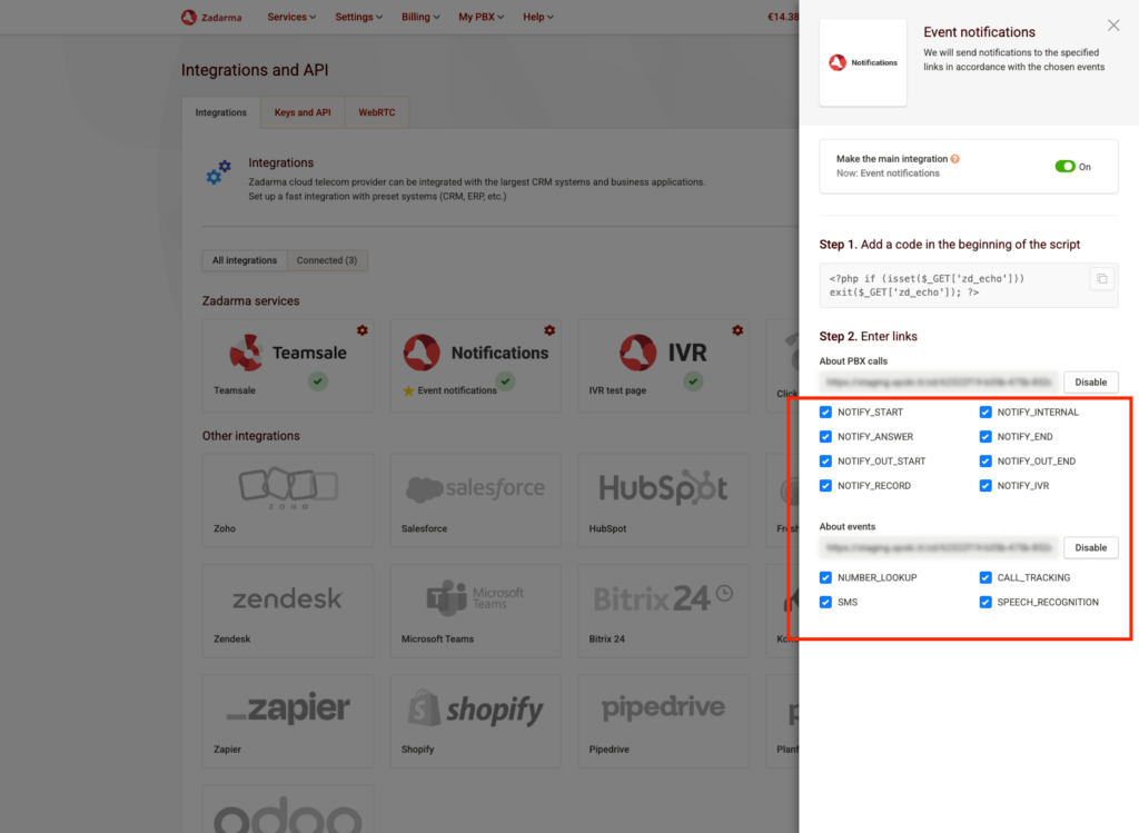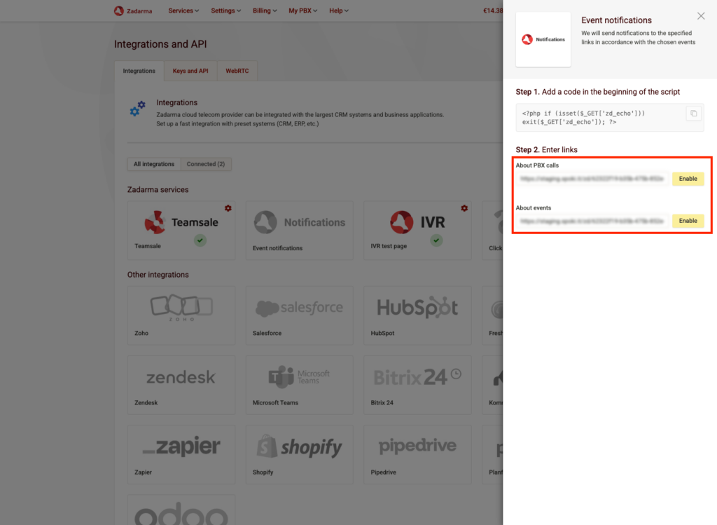 Now take note of the Delivery URL provided, you will need it later in the Zadarma configuration.