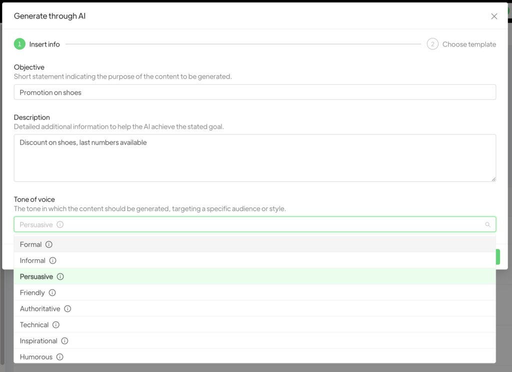 If you choose generation through AI, you will need to indicate the message objective, provide a brief description, and select the tone (persuasive, formal, friendly, etc.).