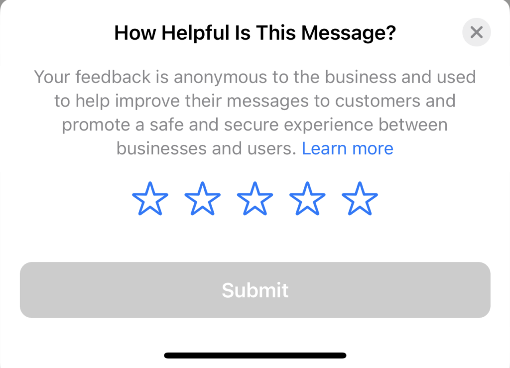 Beyond this possibility WhatsApp asks for feedback regarding your template messages, thus giving all clients the opportunity at any time to report unwelcome messages. Feedback given by the customer is expressed by giving a rating of 1 to 5 stars.
