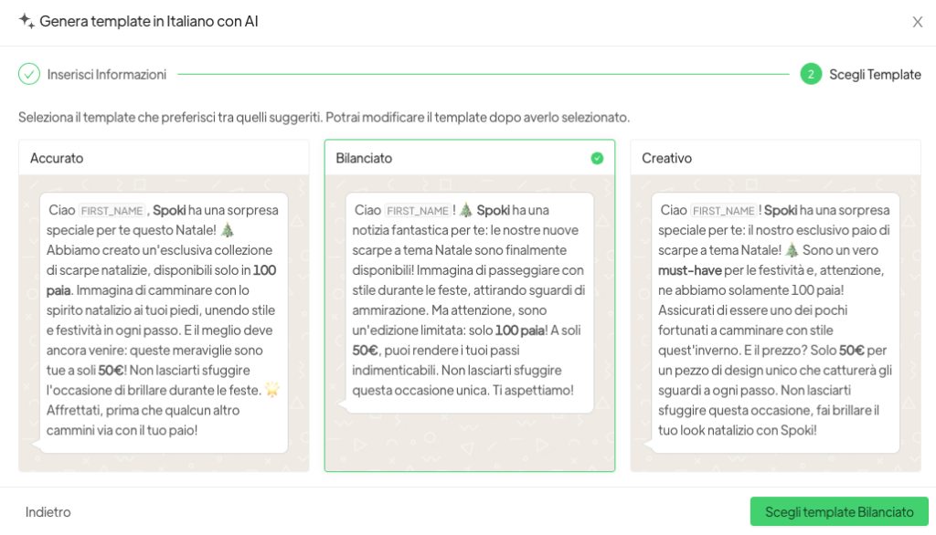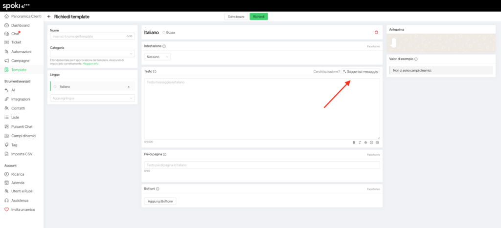 Con la nueva función de inteligencia artificial de Spoki, puedes obtener sugerencias personalizadas para la creación de tus plantillas de forma rápida y eficaz.