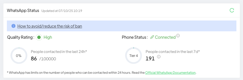 - Estrategia de envío recomendada: envía durante los primeros envíos masivos (por ejemplo, la primera semana) a un máximo de 250 contactos al día (si puedes identificar los contactos más calientes entre tus contactos, se recomienda enviar a menos de 250 contactos). Transcurridas 24 horas desde el envío, supervise en el panel de control si la calidad de la cuenta es Alta o Media, continúe con el envío. Si la calidad es baja, bloquee los envíos posteriores durante 7 días. Transcurridos 7 días, la calidad de la cuenta volverá a ser Alta y podrá volver a enviar mensajes masivos a los clientes. Una vez que haya completado la primera ronda de envíos a su base de clientes (y, por tanto, los que querían darse de baja ya lo hayan hecho), puede pasar a ponerse en contacto con hasta 1.000 clientes al día, controlando siempre la calidad del envío.